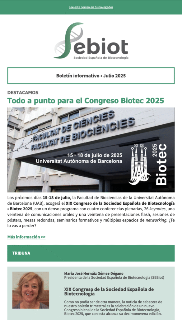 El boletín informativo electrónico de SEBiot, de periodicidad trimestral, acerca a tu correo electrónico una selección de las noticias y eventos más interesantes publicados en nuestra web. También incluye artículos de opinión y tribunas de nuestros miembros.